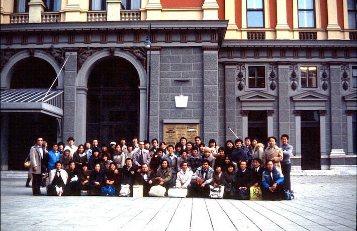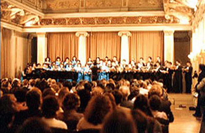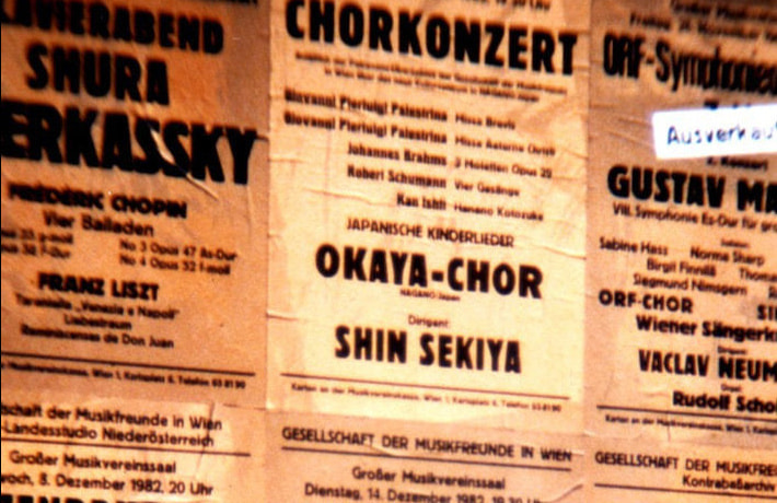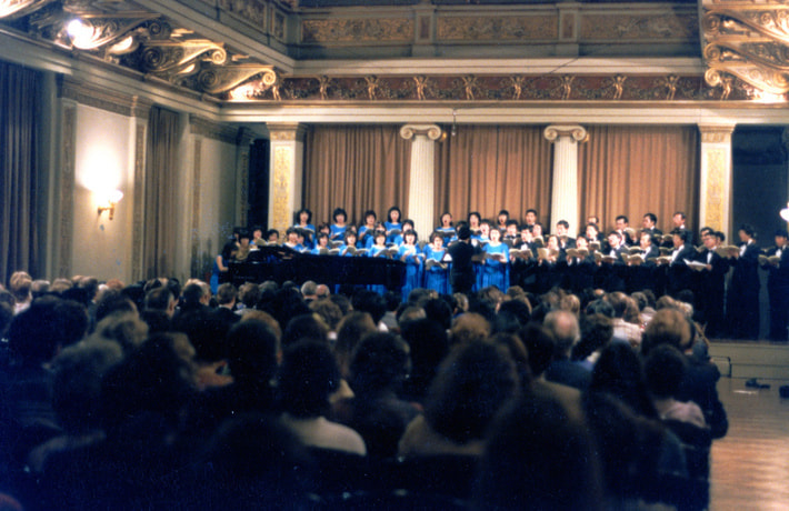 岡谷合唱団が長野県の使節合唱団として行ったウィーン楽友協会。ブラームス・ザールでの演奏会は感激だった。以前にもコンクールの入賞式演奏を大ホールでやったりしたことはあったが、何しろウィーンは私の第2の故郷と言ってるくらい訪れた回数も多く、大好きな町だが、演奏会ははじめてだった。音楽の都で客は入るんだろうか。私はそんな心配ばかりしていた。なのに岡谷の連中はノンキ。朝の食事から、牛乳がなくなったのでお替わり、ジュースがない。ハム・ソーセージがなくなったと大ぎ。お腹を壊したらと言う私の心配なんか、どこ吹く風と食べまくり、ニコニコしていた。