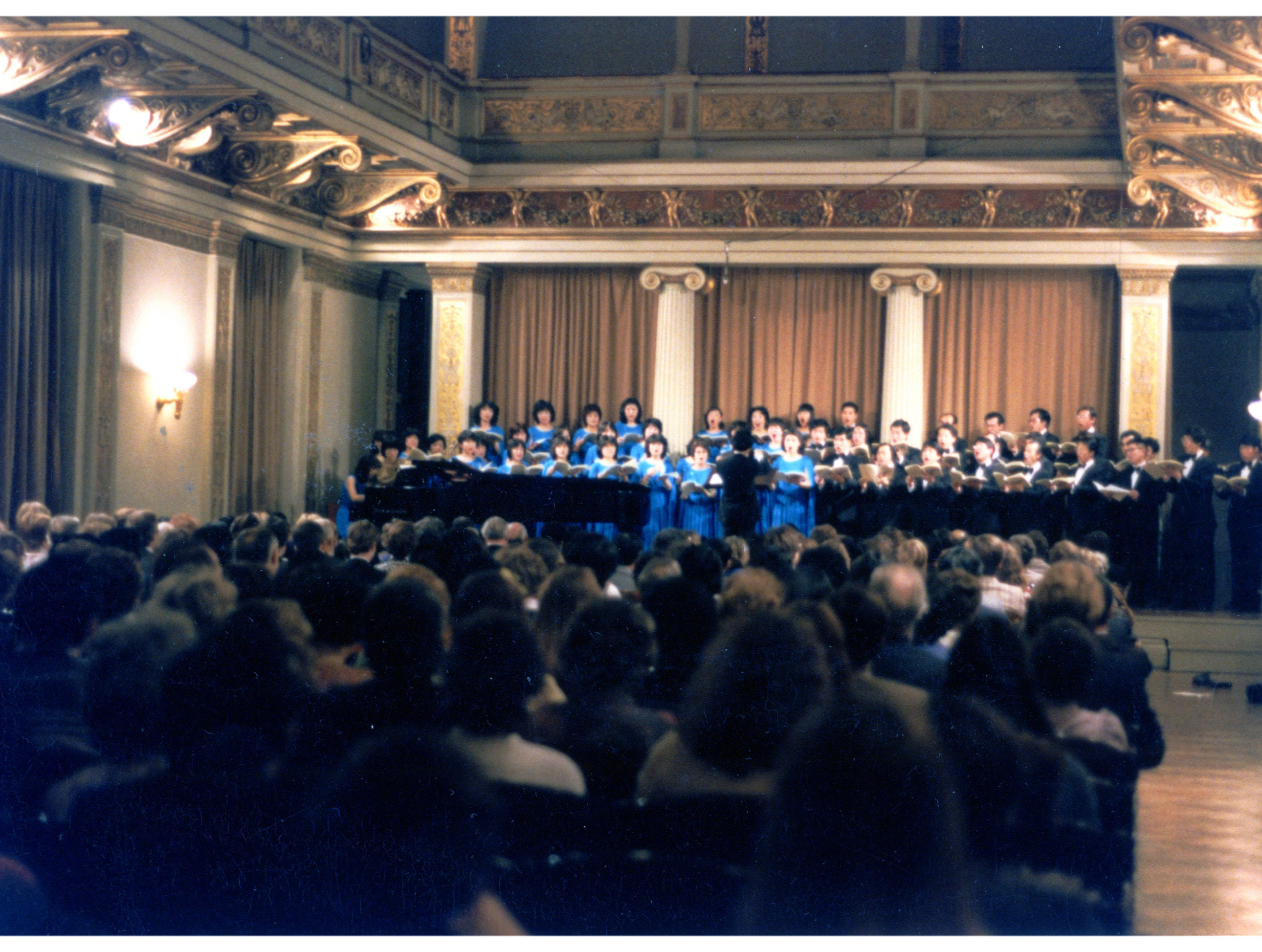 長野県民文化会館がウィーン楽友協会会館(ムジークフェラインザール)との姉妹提携を模索したのは1981年2月のことである。その中心にいたのが言わずと知れた林昭男氏である。彼の突拍子もない構想に皆が呆れている内に、それが実現していくのである。そして何と言っても嬉しかったのはウィーンにおいて開かれる調印記念念演奏会に岡谷合唱団が招待されたことである。この年から岡谷合唱団の常任指揮者に就任されたのが関屋晋先生だった。早速どんな曲を演奏するのかを検討する中で、関屋先生から「メインに《花之伝言》を持って行きたい」とのお話しがあった。1981年11月に放送され「昭和56年度文化庁芸術祭優秀賞」を受賞した新作で、団員はだれも聴いたことがなかった。中部地方の祭事による4曲からなる混声合唱組曲で、最も盛りあがる部分は10声にもなる難曲である。私のところに石井歓先生自筆のコピー譜が送られてきたのはそれから間もなくのことであった。自筆譜は読みづらくしかも分厚く大きな原譜を団員にコピーし配るのは至難の業と考えた。いっそ全てを写譜して綺麗にまとめてみようと、とんでもないことを考えついた。それから2ヶ月かかって写譜が完成し皆に配ることができた。後に作曲者の石井先生から「綺麗にできているねえ、ぼくに5冊楽譜を分けてくれない?」と言われたときは嬉しかった。
