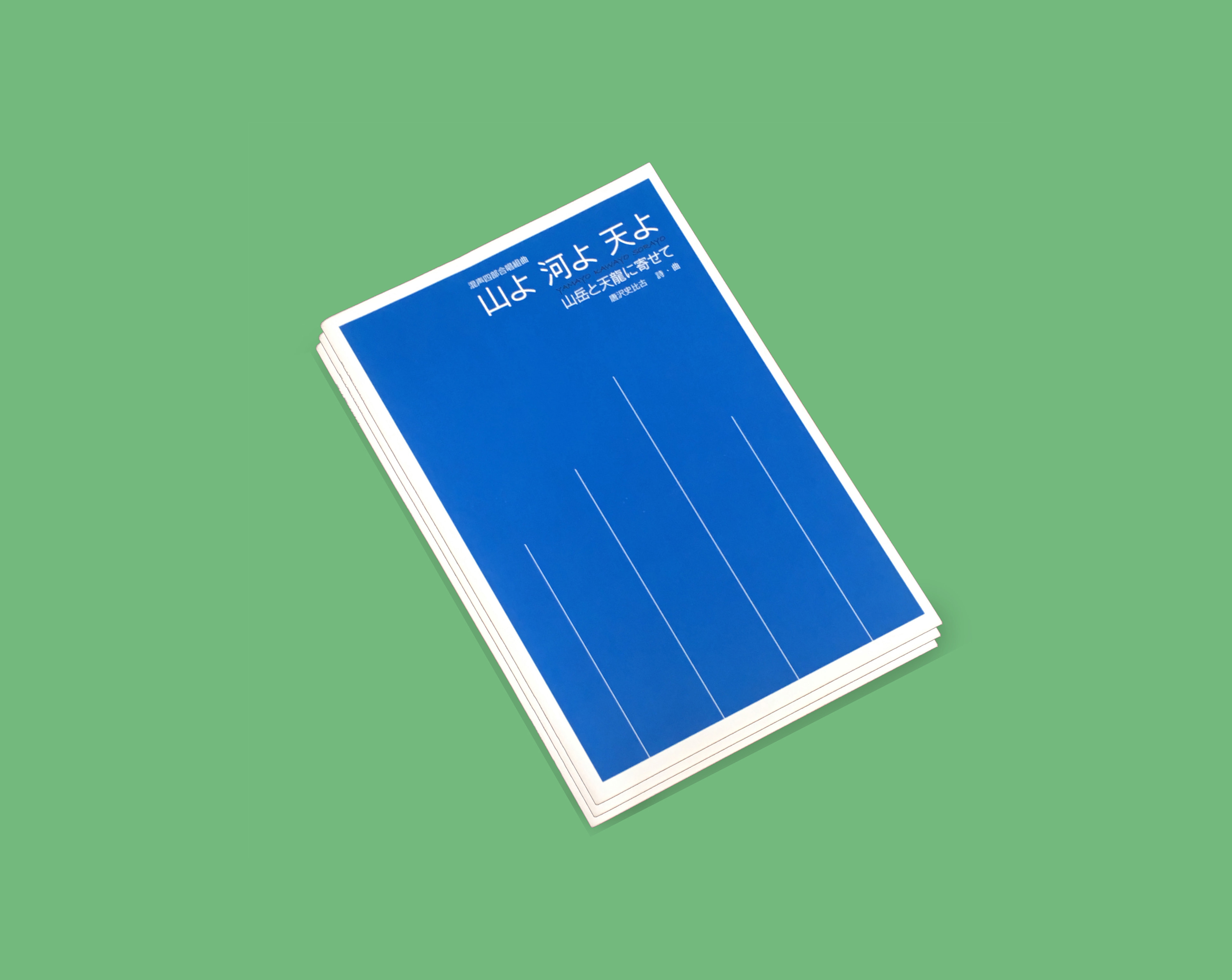 ◎南信合唱連盟は創立50周年を迎え、記念として、地域を南下する天龍川の流域を網羅する、壮大な合唱組曲を、地元の作曲家である唐沢史比古氏に作曲を依頼した。出来上がった楽譜の巻頭に作曲者ご自身のコメントが掲載されているので、そのままここに記すことにした。楽譜の表紙は一目でこれとわかる物にしたかったので、いろいろイラストを考えたのだが、白く光る山々、とうとうと流れる天龍川、真っ青な空をイメージしている内に、最もシンプルな白線を山々の頂点として、青空を押し上げていくように並べてみた。